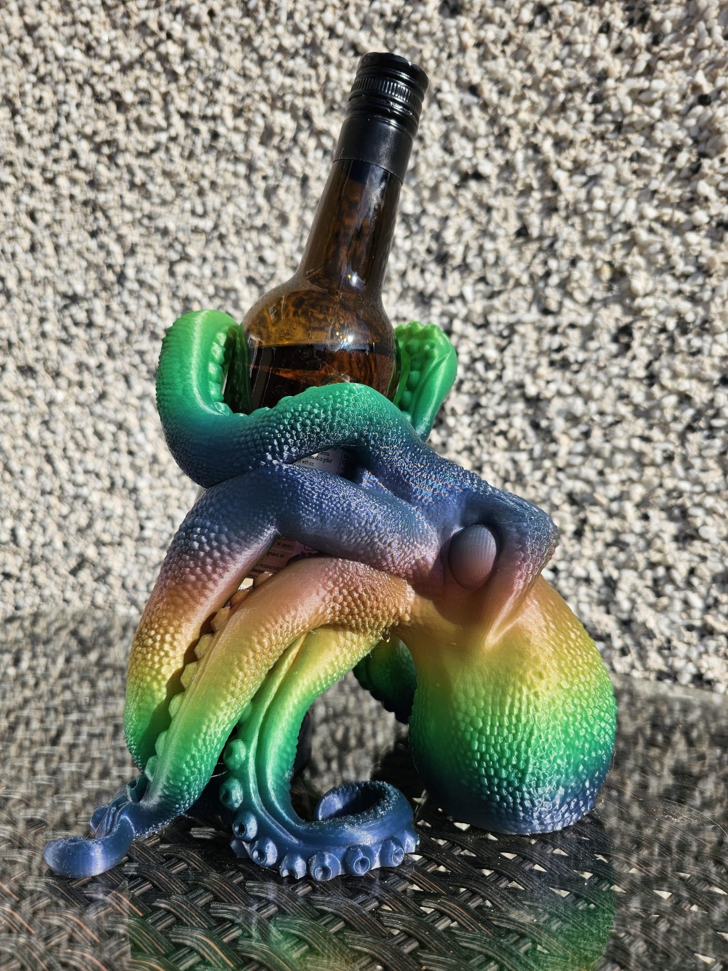 3d printed Octopus wine bottle holder. Happily holds 3" wine bottle nice and secure. Would make an amazing centrepiece on a table or in a cabinet holding your favourite bottle.