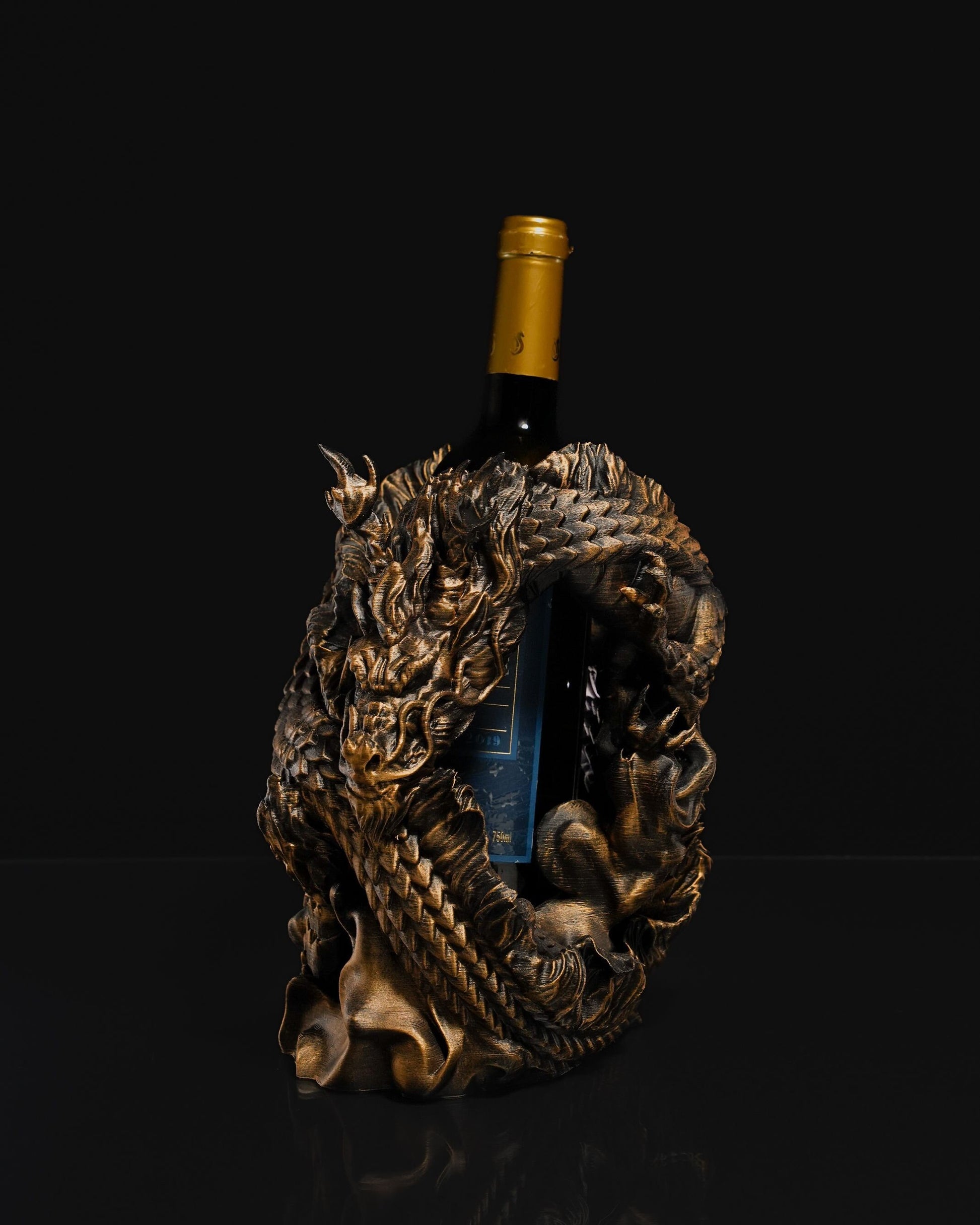 Chinese dragon themed 3D printed wine bottle holder. This intricate sculpt is printed in one piece vertically and stands around 22cm tall. Suitable for most wine bottles (not included)