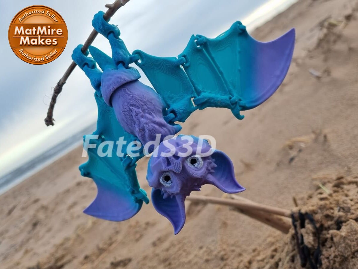 3D printed cute articulated bat made to order in your choice of colour. You can flap its wings, hang it upside down and can make it stand using its wings. Elastic bands looped through the back aid the wings to flap open and closed.